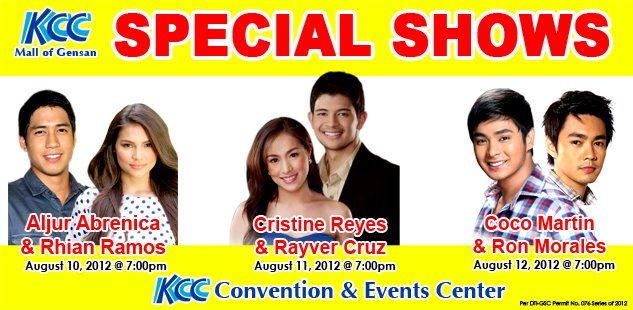 Kapusos Aljur Abrenica & Rhian Ramos will be performing at the KCC Convention & Events Center first on August 10, 2012 (Friday) from 7:00pm onwards. For a free ticket, buy P800 worth of merchandise from KCC Department store and have them redeemed at their redemption center.